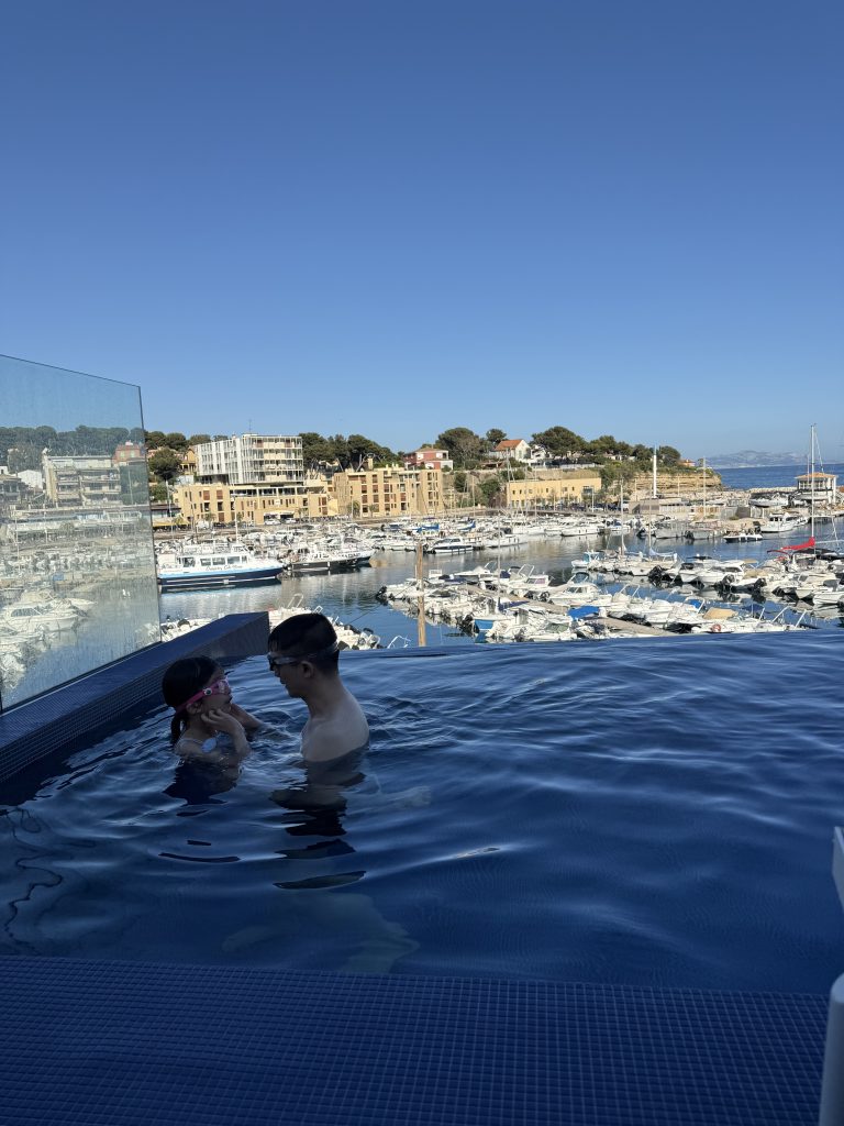 Let’s start with my most favourite hotel. So, starting at number one is Hotel Bleu in Marseilles. I went to this hotel in 2025. Hotel Bleu is a beautiful ocean boat dock view hotel. All the staff are really nice, but do you know what is really the best part of this hotel? It’s the pool! The pool is outdoor, but it was just so clean, and it was an infinity pool. We would always stay in the pool for most of the time at the hotel.